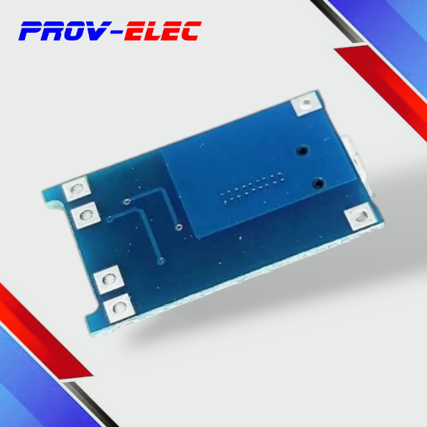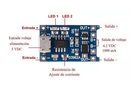 Modulo cargador de baterías de Litio (Li-ion) miniatura. Usa el chip cargador TP4056 configurado en una corriente de carga de 1A.