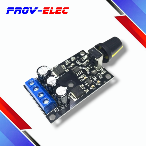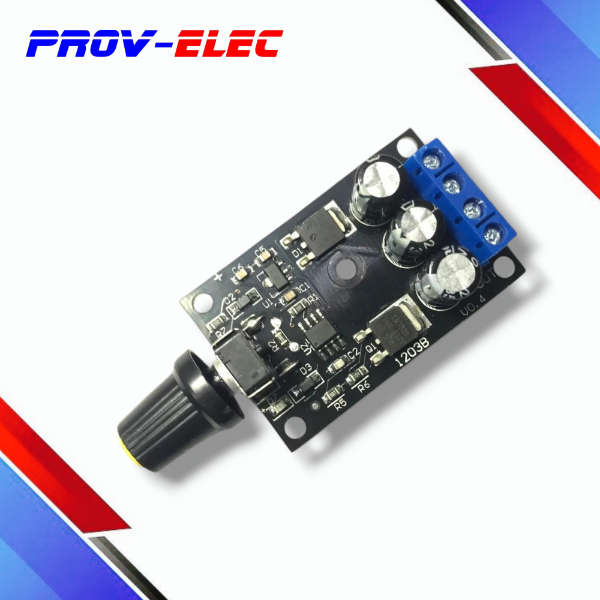 Este controlador de velocidad para motores de Corriente Continua (DC) utiliza un ancho de pulso modulado (PWM) de tensión continua con un ciclo de trabajo ajustable desde 5% al 100%.