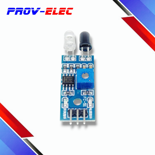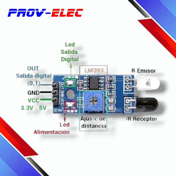 Este modulo esta conformado por un LED emisor infrarrojo y un fotodiodo el cual es sensible a la intensidad. El haz infrarrojo emitido al ser reflejado por el obstaculo es detectado por el fotodiodo, la señal del fotodiodo es comparada por el LM393 con la referencia del potenciometro. La distancia de deteccion es configura con el potenciometro. La salida del modulo es digital